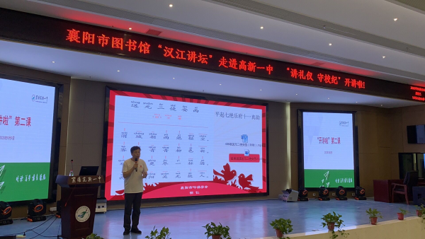 在第36个教师节到来之际,2020年9月9日下午,由中共襄阳市委宣传部、襄阳市文化和旅游局主办,襄阳市图书馆承办的面向全市市民的大众性公益性讲座“汉江讲坛”走进高新一中,成功开讲。