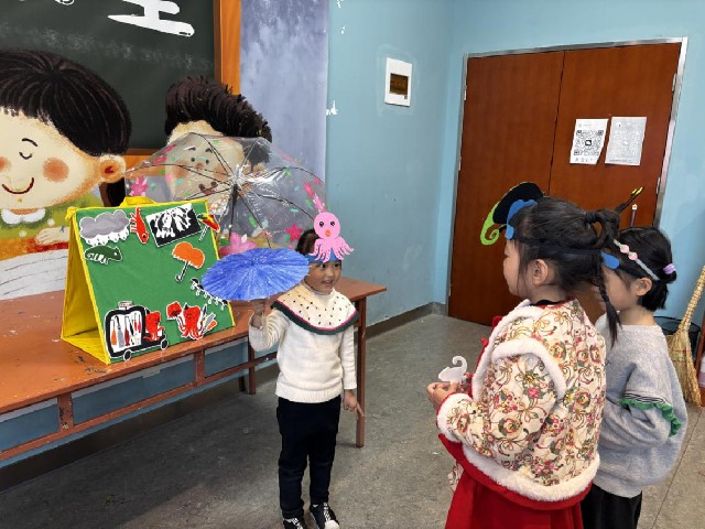 在互动表演环节,孩子们分别扮演了章鱼先生、小兔子、小蚂蚁、小孔雀等故事角色。他们戴上可爱的头饰,穿上简单的道具服装,用自己理解和演绎的方式,将章鱼先生如何根据不同动物的特点售卖雨伞的故事生动地再现出来。