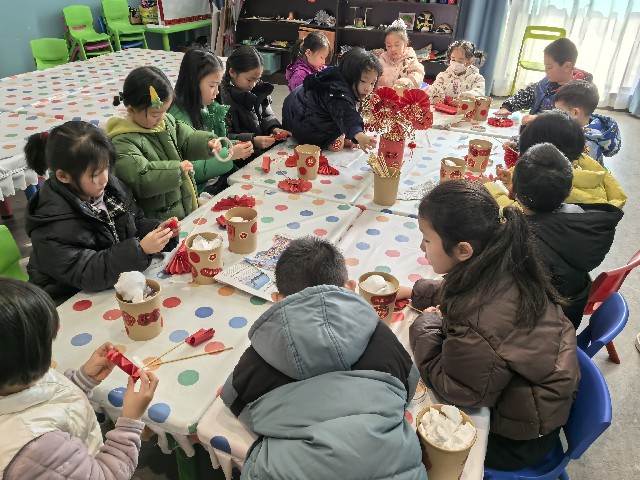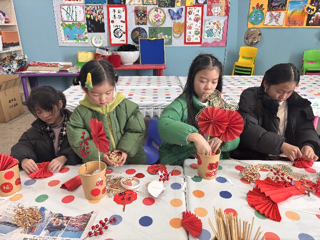 在老师的指导下,孩子们先将寓意“开门红”的红纸包裹好福桶,然后按照色彩层次和构图美学,将一颗颗火红仿真发财果穿插在花丛间,再调整金色扇叶角度,最后,点缀上几枝灰绿色的尤加利,丰富视觉层次。红与金的碰撞,配上低调的灰绿,显得既热烈奔放又不失高雅格调。
