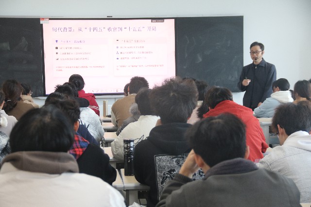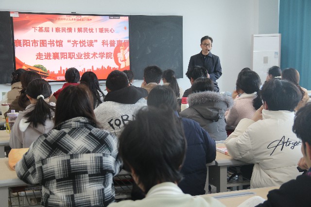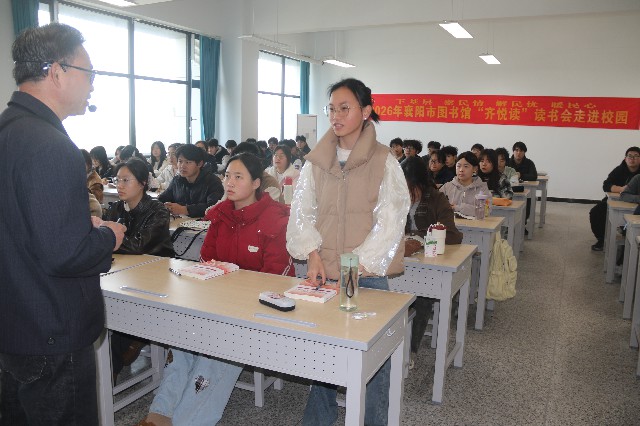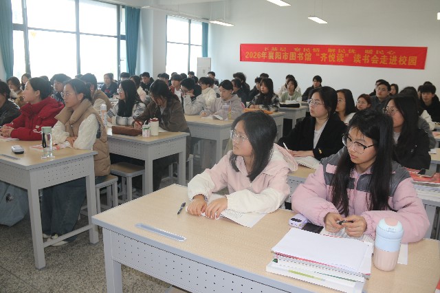 为了全面贯彻落实“十五五”规划的良好开局,锚定目标,系统推进高质量发展、新质生产力培育与民生福祉升级三大核心任务,襄阳市图书馆开展“下基层、察民情、解民忧、暖民心”实践活动,更广泛倡导“科阅融会贯通”的全民阅读,3月25日上午,百余名师生齐聚襄阳职业技术学院高铁南校区嘉禾楼205室,聆听由襄阳市图书馆“齐悦读”读书会联合襄阳职业技术学院马克思主义学院特别邀请襄阳职业技术学院马克思主义学院教授张爱民,为大家分享“数说2026全国两会”的全民阅读话题。
