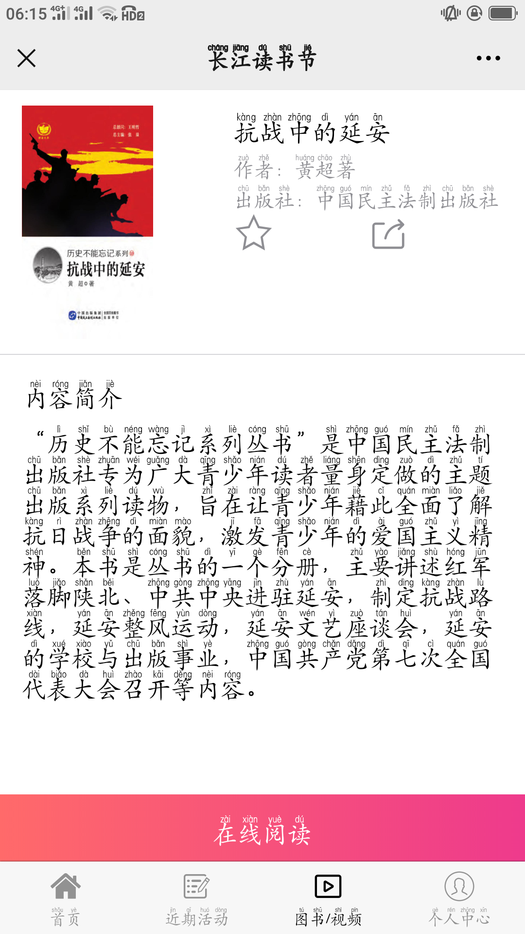 襄阳市图书馆“齐悦读”读书会第283期 [线上共读] 《抗战中的延安》,每周“齐悦读”将推出一本图书电子版书籍进行共读,请先关注湖北省图书馆微信公众号,进入后点击——我的图书馆——长江读书节——最下方第3项 图书/视频——上方图书——全部——向下滑动阅读《抗战中的延安》——阅读本书(无需下载可直接阅读),让我们一起携手同行共同悦读成长!