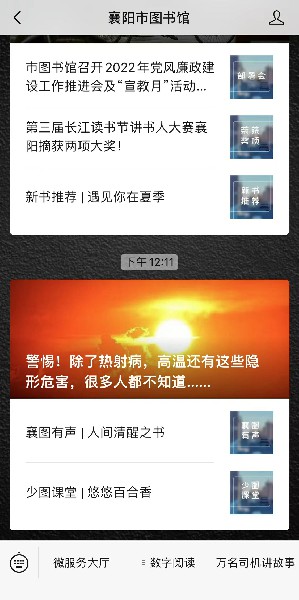 目前,襄图微信公众号粉丝已超11万,平台坚持以读者为中心,关注社会热点,了解近期人们关心的社会现象,每周以固定版块的形式,主动向公众推送获奖图书、热门图书信息,同时结合热点事件和流行文化,将图书馆相关活动和馆藏推送给读者。