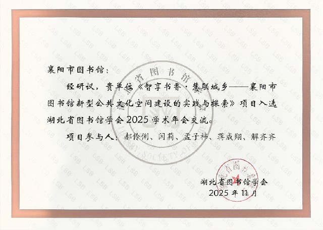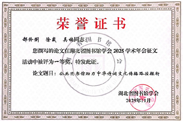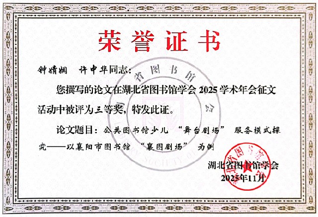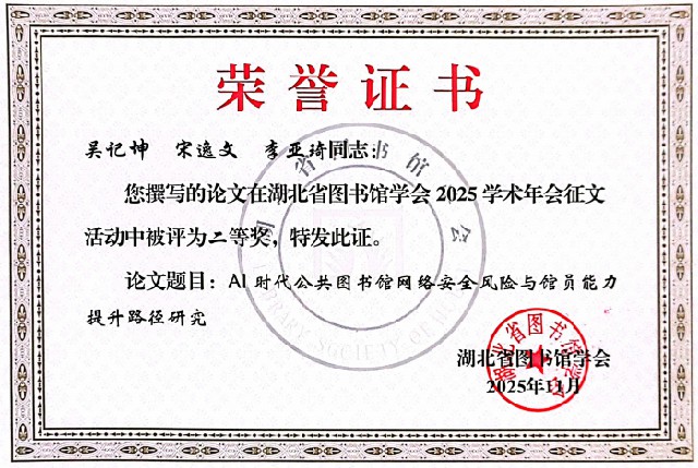在学术征文评选环节,郝伶俐等3名同志撰写的《公共图书馆助力中华诗词文化传播路径探析》一文,荣获学术征文一等奖;吴记坤等3名同志撰写的《AI时代公共图书馆网络安全风险与馆员能力提升路径研究》一文荣获学术征文二等奖;钟婧娴等2名同志撰写的《公共图书馆少儿“舞台剧场”服务模式探索——以襄阳市图书馆“襄图剧场”为例》一文荣获学术征文三等奖。