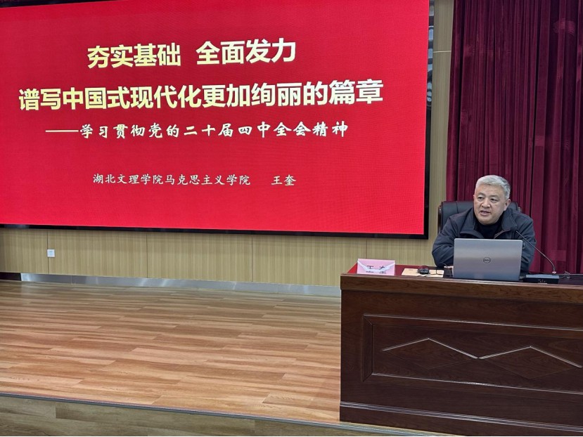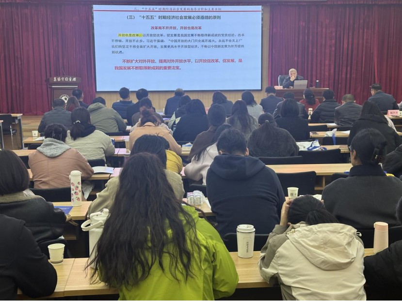 讲座中,王奎教授以《夯实基础 全面发力 谱写中国式现代化更加绚丽的篇章——学习贯彻党的二十届四中全会精神》为题,围绕深刻认识二十届四中全会的重要意义、“十四五”时期的历史性成就与实践底气、“十五五”时期发展的指导方针和主要目标、“十五五”时期发展的战略任务和重大举措、以及学习贯彻二十届四中全会精神的实践要求等五个方面,对全会精神进行了系统、深入的解读。