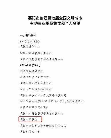 ·襄阳市图书馆荣获襄阳市委、市政府授予的襄阳市创建第七届全国文明城市有功事业单位集体嘉奖奖励