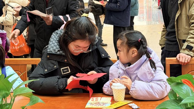 主题读书会上,武侠迷与诗词爱好者通过经典片段演绎、诗词朗诵、主题研讨等形式,推动“侠义”精神在当代语境下焕发新的思想活力。非遗体验区中,市民在老师的指导下制作蕴含古城墙、汉江、新年元素的剪纸作品,实现文化体验与技艺传承的双向赋能。由郭靖、黄蓉等9位经典侠义形象组成的“侠义天团”NPC 全程互动,通过合影留念、文创赠送等形式,让本土文化以鲜活形态融入市民生活。
