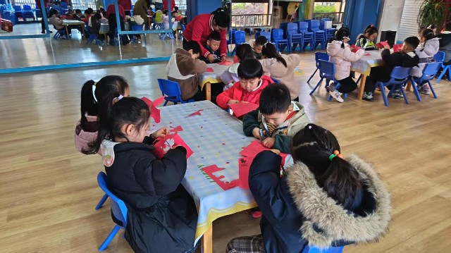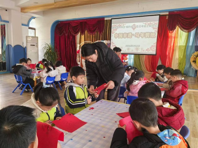 在老师的细心指导下,小朋友们兴致勃勃地拿起剪刀和红纸。虽然孩子们的小手还不够灵活,但眼神中充满了专注。伴随着“咔嚓咔嚓”的清脆声响,一张张红纸在孩子们手中折叠、剪裁,变成了一幅幅生动形象的马年主题镂空剪纸作品。