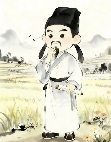 以传统水墨为底,用 Q 萌的笔触勾勒出孟浩然的可爱模样:圆乎乎的脸颊,身着素色襕衫立于春日的田野间,手中书卷半卷,似在构思下一句田园诗行。远山如黛、飞鸟入云的背景,正是 “绿树村边合,青山郭外斜” 的诗意写照。这一形象将孟浩然的诗心与童趣结合,让传统文化以更轻松的姿态走进年轻读者的视野。
