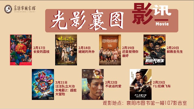 马年启新程,光影寄温情。为丰富广大市民春节期间的精神文化生活,发挥图书馆公共文化阵地服务功能,襄阳市图书馆(少年儿童图书馆)特推出“马年传情·影伴新春”主题电影放映活动,精选阖家欢乐的亲情影片,以光影为媒、载团圆之意,邀请广大市民走进图书馆,在视听盛宴中感受年味、体悟温情,共度一个有书香、有温度的新春佳节。