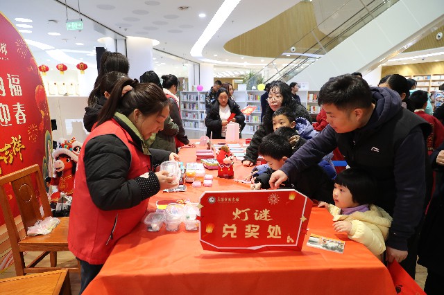 “灯谜竞猜·书香兑礼”环节堪称现场的流量担当,人气爆棚、热闹非凡,是市民打卡的必到之处。不同于传统灯谜,此次百余条谜题精心设计,紧扣“书香”核心,涵盖文学经典、历史典故、科技常识、民俗风情等元素,兼具知识性、趣味性与本土性,既考脑力,又传文化。现场,读者们驻足凝神、各抒己见,有的低头思索、眉头微蹙,有的轻声交流、分享思路,还有小朋友拉着家长的手“求助”,答对者可直接兑换书香小礼品,在比拼学识、收获乐趣的同时,更在潜移默化中感受中华文字的精妙与传统文化的博大精深,让书香与灯谜碰撞出别样火花。