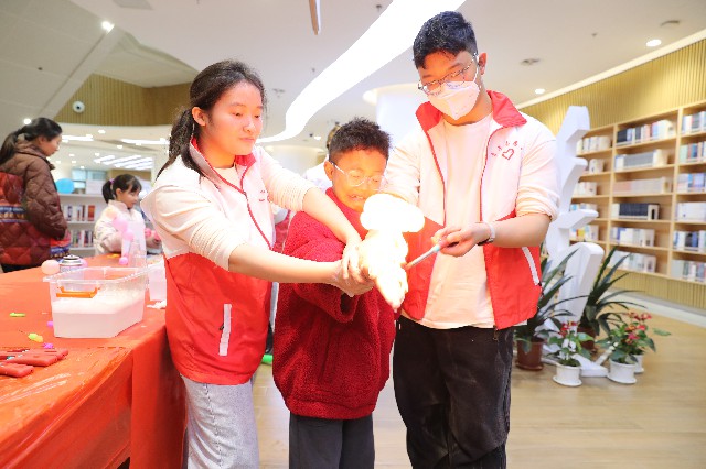 “科普体验·书香启智”则为传统文化市集注入了别样科技活力,实现了民俗文化与科学普及的双向赋能。活动联动优质科普资源,精选气球糖葫芦、火焰掌、气动纸火箭、覆杯实验等一系列简易有趣、视觉感强的科普小实验,专门邀请专业文化志愿者现场指导,让大人小孩一同动手操作、大胆探索。孩子们在家长的陪同下,近距离见证“火焰掌”的神奇、“纸火箭”的升空,在动手实践中解锁科学奥秘、传播科学知识,尖叫声、欢呼声此起彼伏。这一环节既为传统元宵增添了科技新意,又拓宽了市民的科学视野,真正实现了“玩中学、学中乐”,让书香与科技碰撞出别样活力。