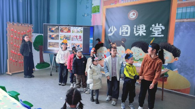 最精彩的角色扮演环节,孩子们化身公鸡、农场主等角色,佩戴简易道具、搭配生动肢体,自信演绎“清晨叫醒农场”的趣味情节。小演员们大胆开口、配合默契,彻底告别英语表达的羞涩。